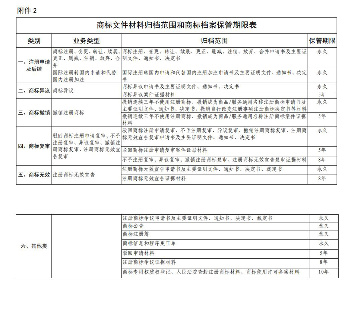 2.《商标文件材料归档范围和商标档案保管期限表》