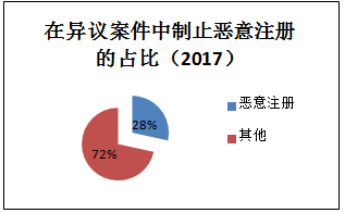 2017年,在不予注册及部分不予注册的20184件异议决定中,属于制止恶意注册的共有5734件,占异议成立(部分成立)案件的28.41%,其中适用《商标法》第七条“违反诚实信用原则”及结合具体条款的有1212件,占6%;适用第十三条对驰名商标进行扩大保护的有2352件,占11.65%;适用第十五条“关于代理人或代表人抢注”有246件,占1.22%;适用第三十二条对其他在先权利进行保护或制止恶意抢注的有1924件,占9.53%。恶意异议得到有效遏制,有效维护了在先权利人的合法权益,营造了良好的市场竞争秩序,异议程序维护各类在先权利的救济功能得到充分发挥。